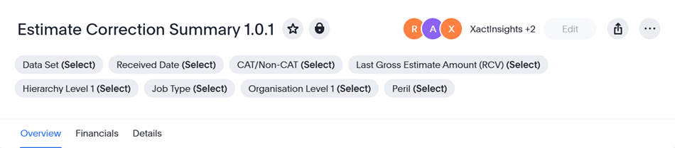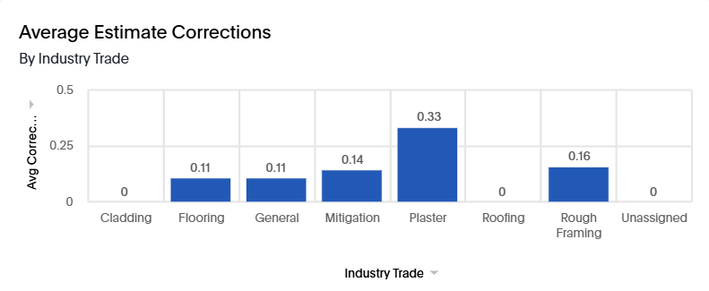 This liveboard is based on the Estimate Correction Summary management report in XactAnalysis; you can use this liveboard to track corrections on estimates and monitor the changes in the final estimate value.