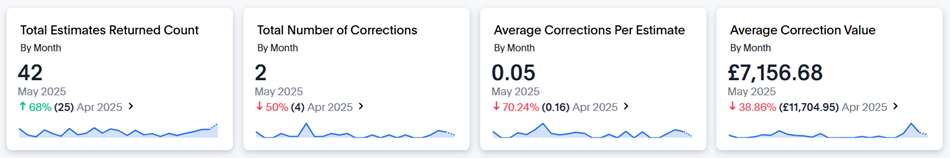 There are four KPI charts across the top of the Overviews tab: Total Estimates Returned Count by Month, Total Number of Corrections by Month, Average Corrections per Estimate by Month, and Average Correction Value by Month.