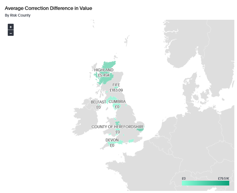 This graph displays and compares the average correction difference for each risk county. You can zoom in on the map to see more detail.