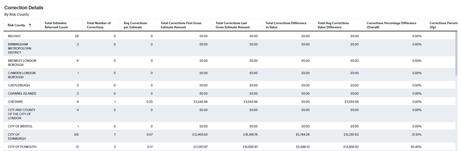 This tab contains several charts, graphs, and tables to help you analyse your estimate correction data, including: