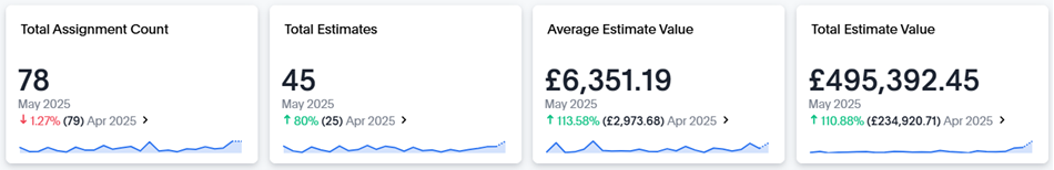 There are four KPI charts across the top of the liveboard: Total Assignment Count, Total Estimates, Average Estimate Value, and Total Estimate Value.