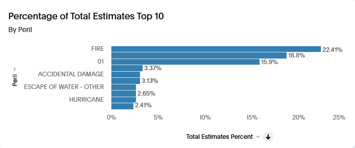 The Peril liveboard allows you to quickly view peril data for your company, including the Average Estimate Value, Total Estimate Value, and Percentage of Total Estimate Value Top 10 by Peril.