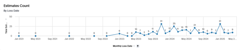 - This shows the number of estimates in the selected month that had roof damage claims that were classified as a replacement. The month for this KPI defaults to the most recent, but you can change it in the filters.