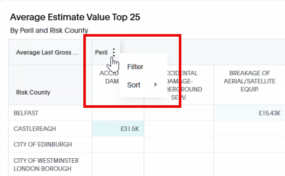 You can sort and filter the table by the average last gross estimate amount, peril, and risk county. Simply hover over the column name, click the More