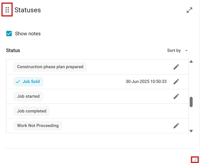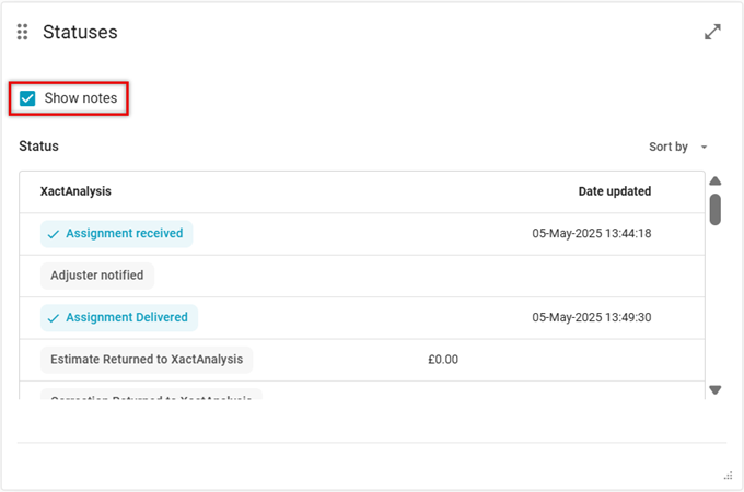 You can choose to show or hide notes on statuses by selecting or clearing the Show notes checkbox on the Statuses widget.