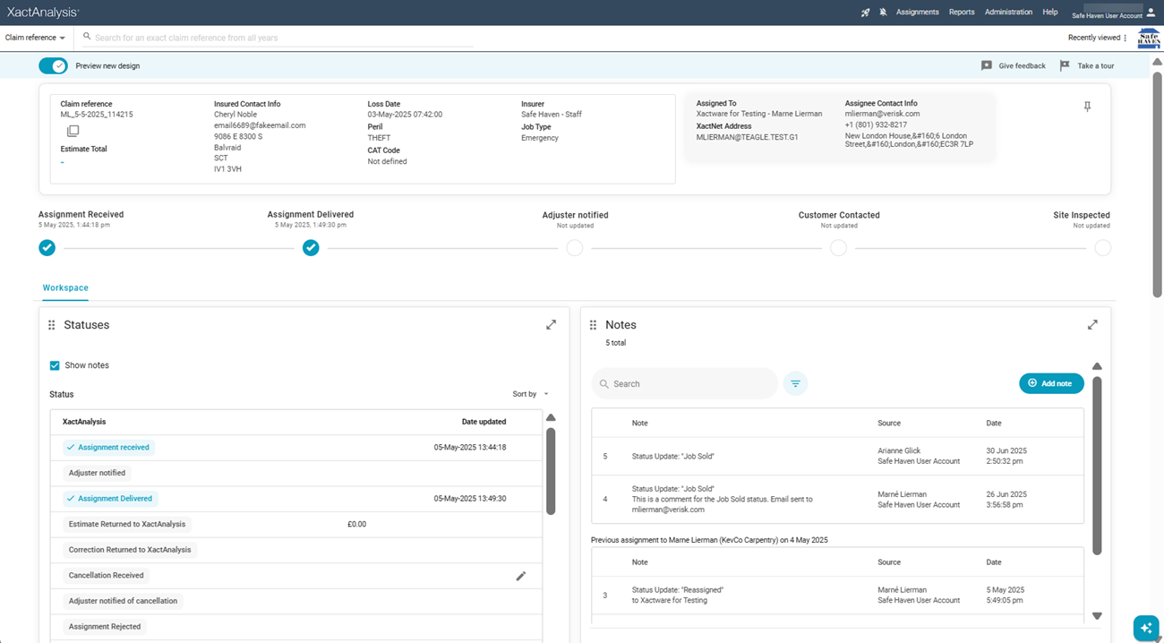The Assignment Detail page is a record of an assignment and the work done to accomplish it. From here, you can easily find the claim number, estimate total, contact information, type of loss, coverage details, notes or comments, current statuses, and more.