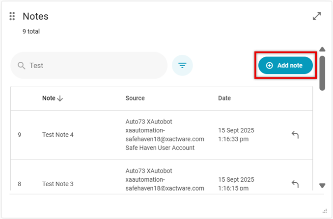 Using the search bar in the Notes widget, you can search your notes by their content or by the person who added them.