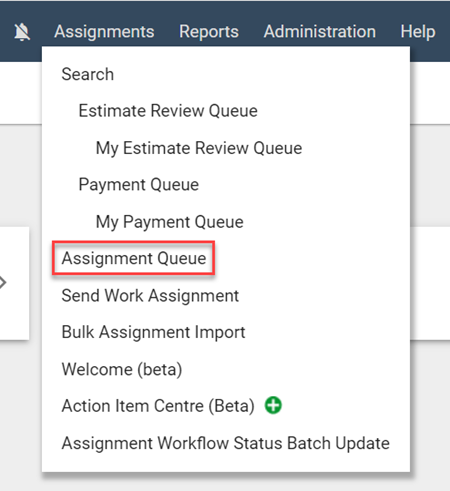 - On the Search page, click Queue Type and select Assignment Queue from the dropdown menu. This filters the list so that only assignments with the status In Assign Queue are shown.