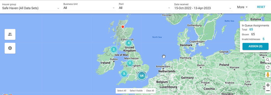 The Assignment Queue map uses Google Maps to display the location of every assignment that is currently in progress (coloured shapes) or unassigned (red location markers).