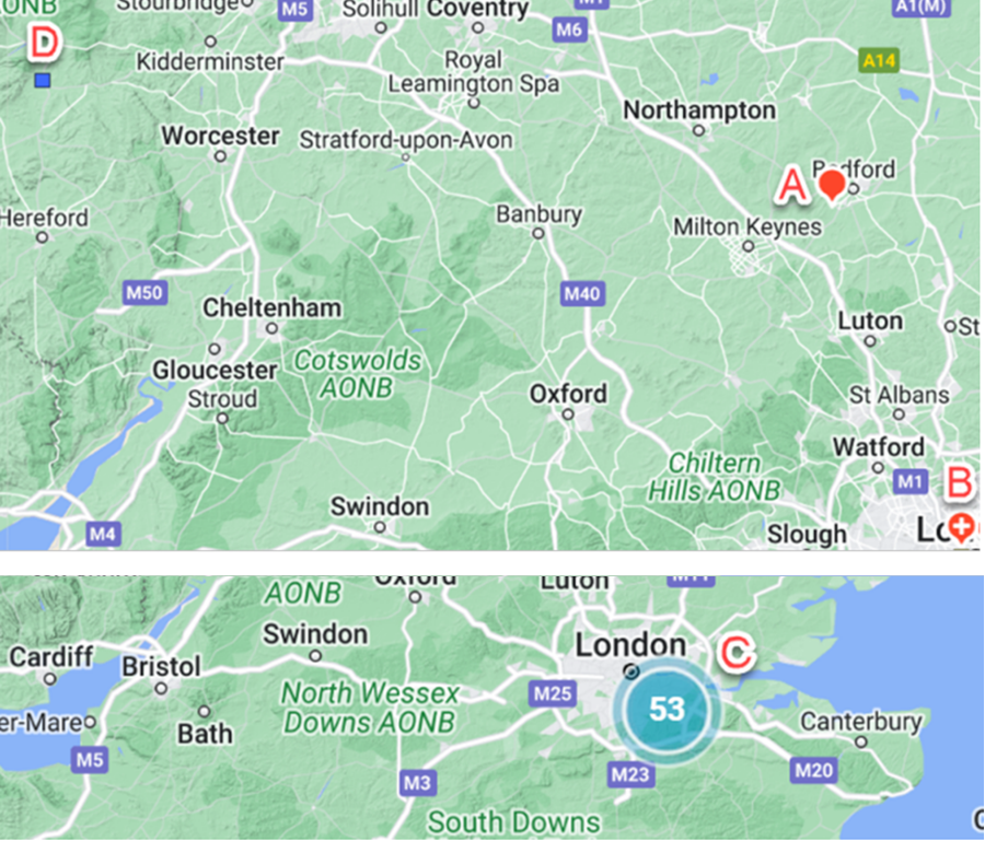 C - Blue circles represent clusters of assignments in an area. The number of assignments is displayed in the circle. Click the circle to zoom in and view the individual assignments and any additional clusters.