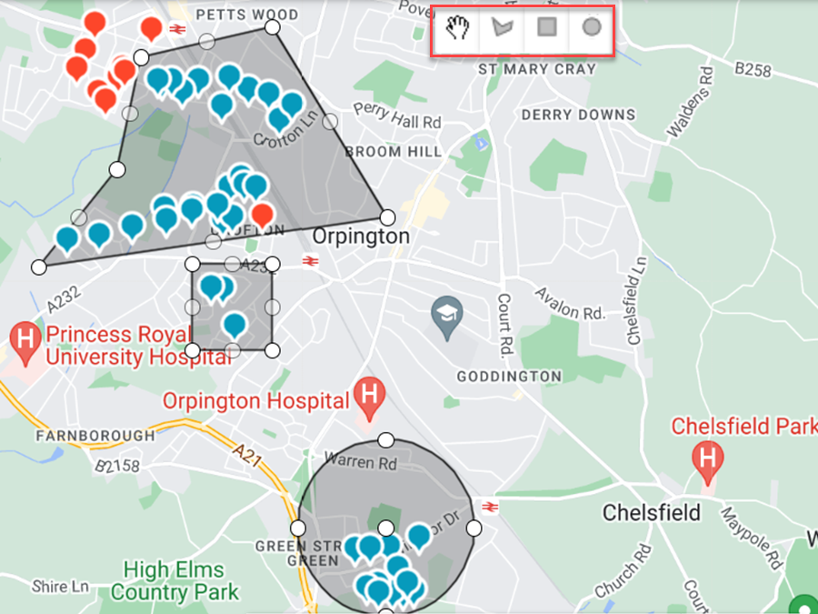 - Select the rectangle tool at the top of the map to draw rectangles around the markers you want to select.
