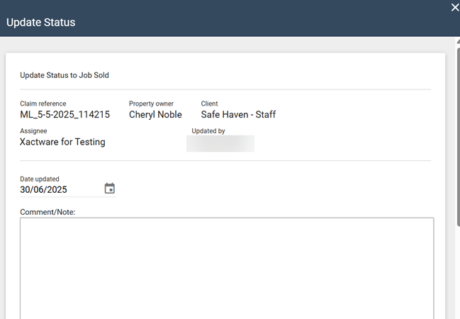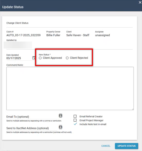 - The comments entered when setting the Work Not Proceeding and Adjuster Notified of Cancellation statuses are now always displayed in the View Status dialog, regardless of whether the status is set via EDI or manually in XactAnalysis.