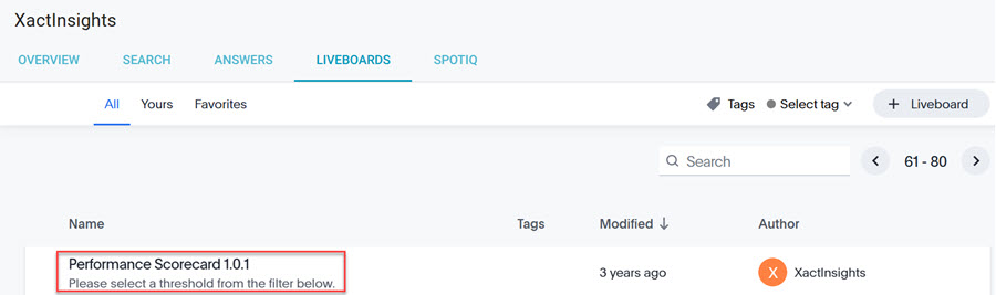 The Performance Scorecard pinboard automatically updates itself to reflect the selected threshold. It’s important to select a threshold when you open the pinboard, as it will remain empty until you do so. You can select a threshold from the Threshold filter at the top of the pinboard.