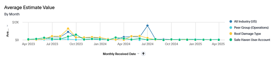 - This shows the number of estimates in the selected month that had roof damage claims that were classified as a repair. The month for this KPI defaults to the most recent, but you can change it in the filters.