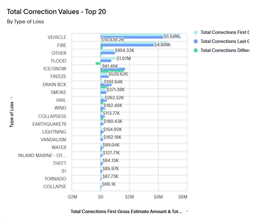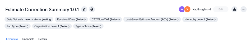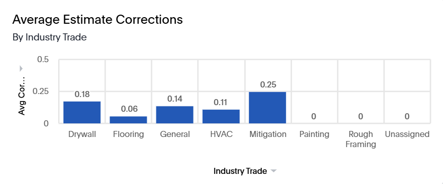 This liveboard is based on the Estimate Correction Summary management report in XactAnalysis; you can use this liveboard to track corrections on estimates and monitor the changes in the final estimate value.