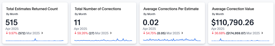 There are four KPI charts across the top of the Overviews tab: Total Estimates Returned Count by Month, Total Number of Corrections by Month, Average Corrections per Estimate by Month, and Average Correction Value by Month.