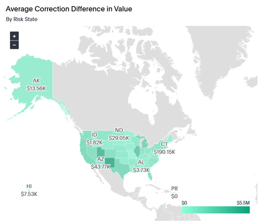 This graph displays and compares the average correction difference for each risk state. You can zoom in on the map to see more detail.