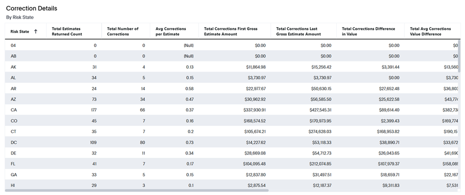 The Details tab hosts the Correction Details by Risk State table, which shows estimate correction data for different risk states. Definitions for the table columns are located directly above the table.