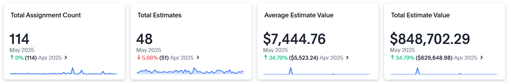 Four of the boxes provide overview numbers for the assignments and estimates that fall within your selected filters:
