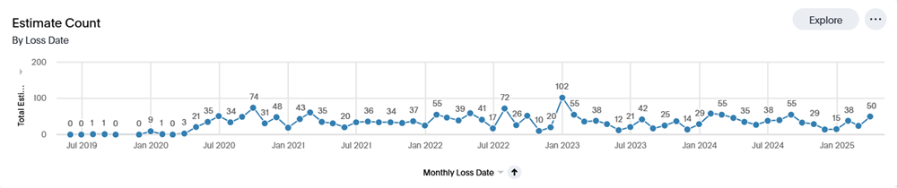 - This shows the number of estimates in the selected month that had roof damage claims that were classified as a replacement. The month for this KPI defaults to the most recent, but you can change it in the filters.