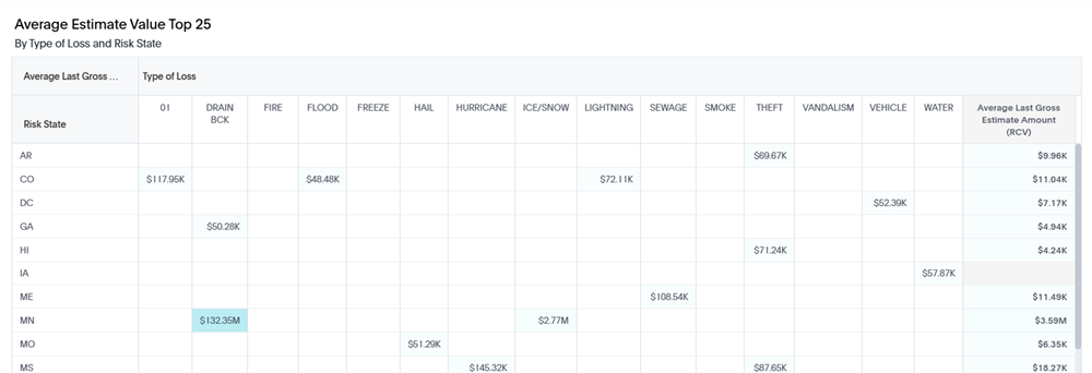 This table displays the top 25 average estimate values for risk states and types of loss.