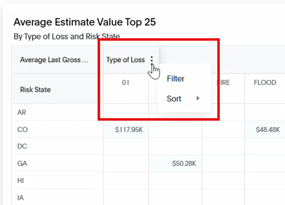 You can sort and filter the table by the average last gross estimate amount, type of loss, and risk state. Simply hover over the column name, click the More