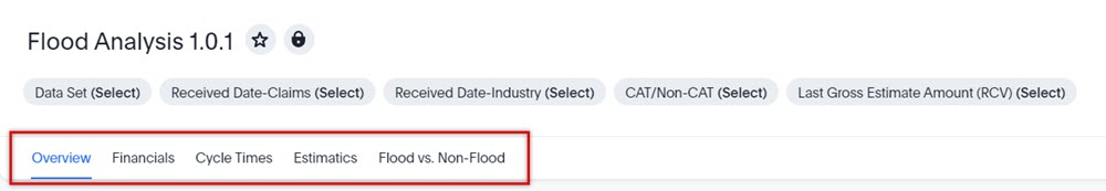 The Flood Analysis liveboard is divided into five tabs: Overview, Financials, Cycle Times, Estimatics, and Flood vs. Non-Flood.