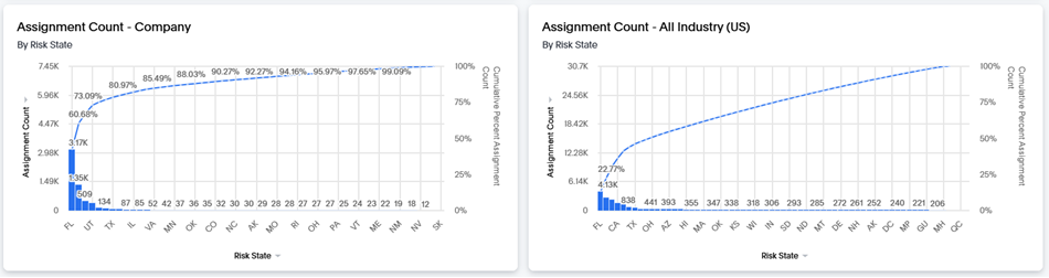 This graph shows the number of assignments in your company according to their risk state. You can easily compare it to the All Industry version of this graph, which is directly to the right.
