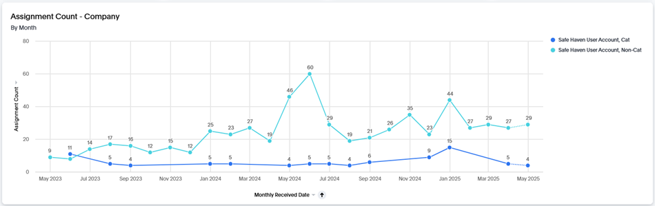 This graph displays the percentage of assignments that had an RCV greater than $0 over time. It also differentiates between CAT and Non-CAT assignments. You can click the CAT or Non-CAT labels to remove that assignment type from the graph.