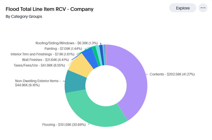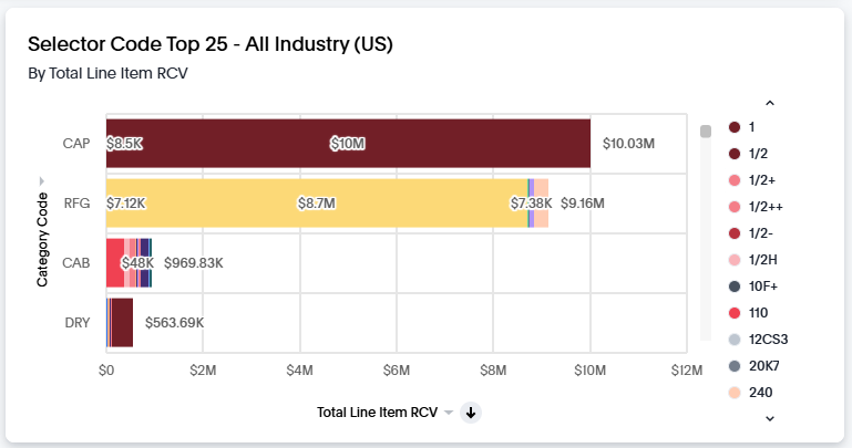 This table displays various statistics for each of your data sets, including: Roof Damage Type, Total Line Item RCV, Total Line Item ACV, Average Line Item RCV, Average Line Item ACV, Average Item Labor Amount, Total Item Labor Amount, Average Item Material Amount, and Total Item Material Amount.