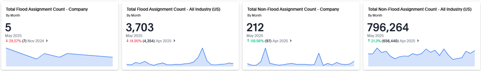 There are four KPI charts across the top of the Overviews tab: Total Flood Assignment Count – Company by Month, Total Flood Assignment Count – All Industry by Month, Total Overall Assignment Count – Company by Month, and Total Assignment Count – All Industry by Month.