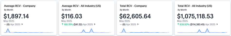 There are four KPI charts across the top of the Financials tab: Average RCV – Company by Month, Average RCV – All Industry by Month, Total RCV – Company by Month, and Total RCV – All Industry by Month.