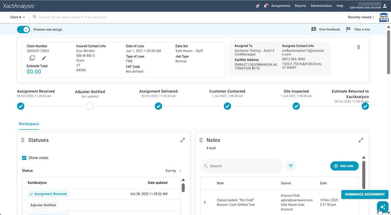 Assignment Summary is an exciting new feature that provides a quick overview of the assignment. It includes an AI-generated summary of the assignment’s notes and loss instructions, along with key claim information, coverages, and the top line items by cost.