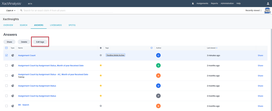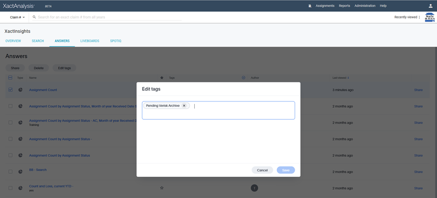 Tags are labels used to organize and locate content within Answers and Liveboards. In XactInsights, tags are created by Verisk to classify and identify content in these areas. Users can apply filters on the Tags column in Answers and Liveboards to quickly retrieve items associated with a specific tag.