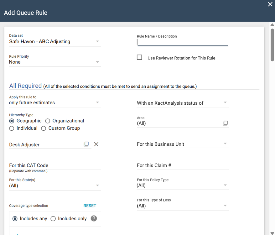 Estimates can have three coverage types: Structural, Other structures, and Contents. Use Includes any or Includes only to determine which coverage type(s) an estimate should have to enter the queue.