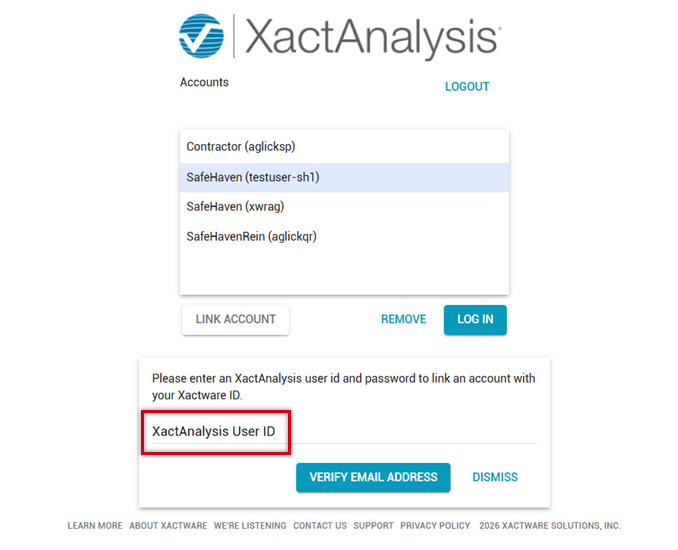 Accounts associated with your primary email address (Xactware ID) appear in the XactAnalysis Accounts area. If an account in this area is not linked with your Xactware ID, the account is labeled "unlinked." To link an account, follow the steps below: