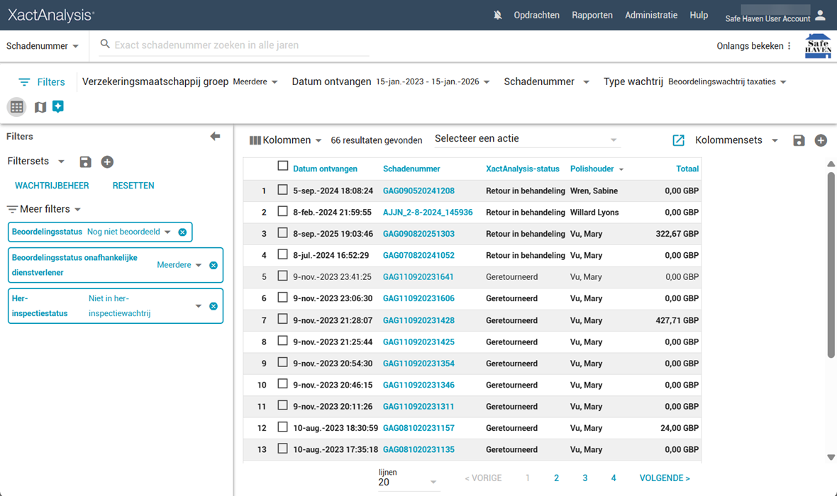 De Wachtrij voor schattingsbeoordelingen is een filter in Zoeken dat alle aangewezen toewijzingen die van uw schade-experts zijn geretourneerd, in een lijst plaatst voor een administratieve beoordeling. De beheerder wijst specifieke schattingen toe aan individuele beoordelaars ter goedkeuring. Als uw account deze wachtrij heeft ingeschakeld, kunt u de huidige status van de toewijzing, zoals 'Schatting niet beoordeeld', zien op de pagina toewijzingsdetails.