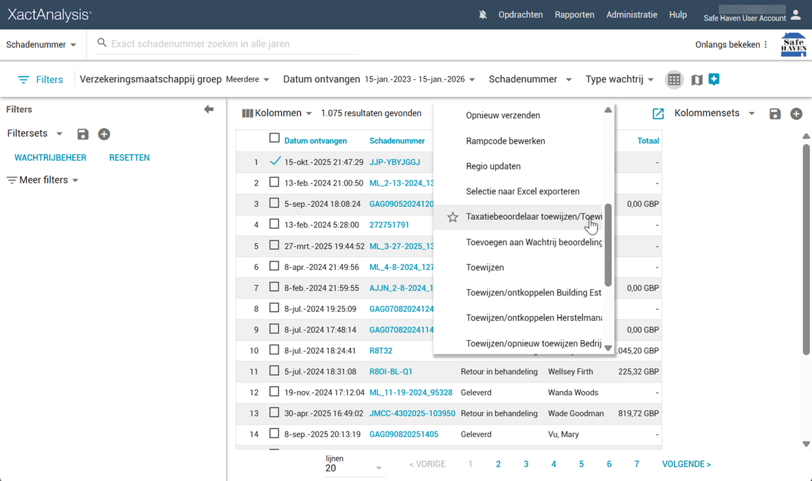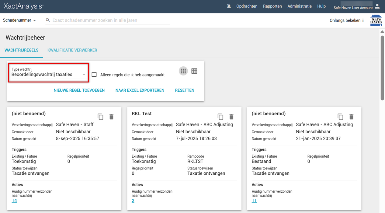 Wanneer u een beoordelaar toewijst in de Wachtrij voor schattingsbeoordelingen, worden alleen de beoordelaars in uw account weergegeven in XactAnalysis. Dienstverlenergebruikers zien geen vervoerdergebruikers, en vice versa. Standaard moeten toegewezen beoordelaars de beoordeling accepteren als een afzonderlijke stap voordat ze deze voltooien. Spreek met uw customer success manager als u deze functie wilt uitschakelen en een beoordelaar een beoordeling wilt laten voltooien zonder deze eerst te accepteren.
